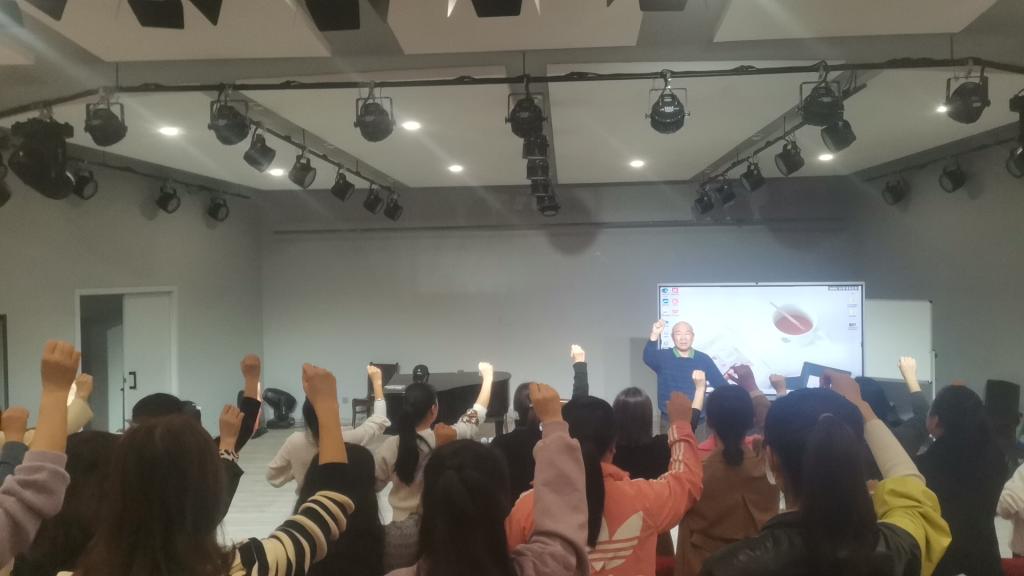 陈家海教授针对目前小学音乐教师在合唱指挥方面知识的缺乏,系统的讲授了合唱指挥的姿势、手势。陈教授给学员讲授在合唱指挥中拍点的重要性,为学员区分了基本拍的挥拍手势,并与学员积极互动,现场纠正出学员动作。陈教授指出了合唱指挥中点的重要性,并且讲授了直线和曲线两种不同的挥拍方式,起拍的气息以及收拍的强弱结合在陈家海教授的双手中表现的淋漓尽致。教导学员在排练过程中如何能发出高质量的声音。陈教授指出,指挥的预示是有感情的,吸气要夸张,演唱状态要恳切,指法的表达要真实。陈教授就收拍的强弱对学员做了详细的指导,获得学员的一致好评。