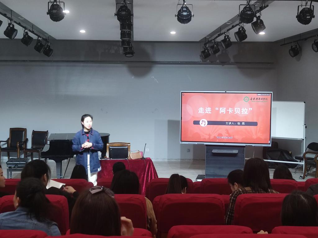 10月28日上午,公司青年教师张思老师在艺术楼八音讲堂带领本次培训学员走进阿拉贝拉的世界。张思老师首先为学员们分好声部,一曲简单的卡农拉开本次课程的帷幕。系统的分析了什么是阿卡贝拉,阿卡贝拉的发展过程与形式,之后带领学员进行节奏训练,学员们积极参加,在上午的课程中,学员们了解到了人声合唱形式也可以如此丰富,同时张思老师为学员们课堂排练歌曲《童年》让学员们在开心和快乐中完成歌曲。