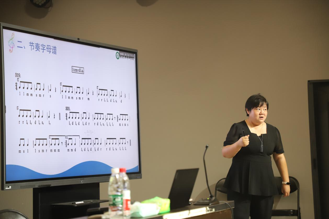 牛媛媛老师首先明确是视唱练耳是音乐学习中的重要基础,然后从如何备课、如何进行教学等问题展开讲授。针对读谱视唱训练、节奏练习、二声部节奏练习、视唱练习和柯尔文手势等逐一进行了全面、细致的讲授和示范。在课程中,牛媛媛老师坚持严谨的学术态度,要求学员们旋律、节奏、音准的准确性,积极分享这一课程针对职业院校员工的教学方法。