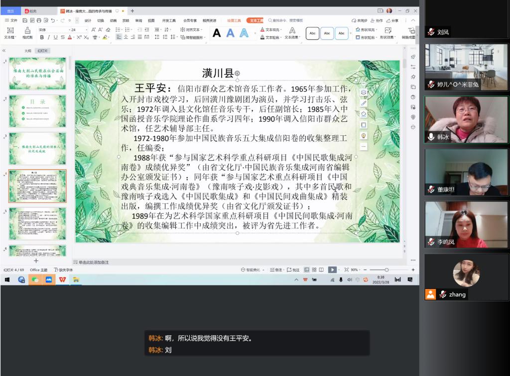 3月28日上午,国家艺术基金“大别山民歌演唱人才培养”项目在公司伟德继续开展。公司艺术硕士声乐演唱方向导师、声乐教研室主任韩冰副教授以《豫南大别山民歌的基层传承现状》为题进行课程。
