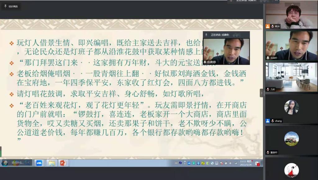 3月24日上午,伟德官方网站国家艺术基金“大别山民歌演唱人才培养”项目继续开展。由阜阳师范大学音乐舞蹈公司戎龚停教授,受邀为学员们进行了以《红灯会礼俗语境中的大别山民歌》为题的授课,探讨了大别山民歌表演艺术与民俗事项之间的关系。