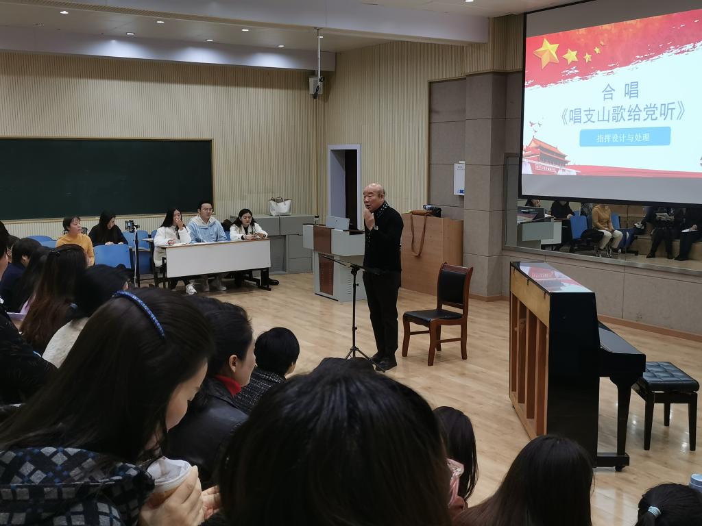 11月19日,陈家海教授以《唱支山歌给党听》作为排练曲目进行示范授课,对全体国培学员进行了排练和艺术指导。他指出合唱主流是头声高位,直声演唱,强调合唱是“和协”的声音,发声要求应“通、透、亮”。陈家海教授的讲座加深了全体国培学员对如何组织排练演唱合唱的理解认知,丰富了学员的合唱指挥理论,提升了合唱指挥水平。