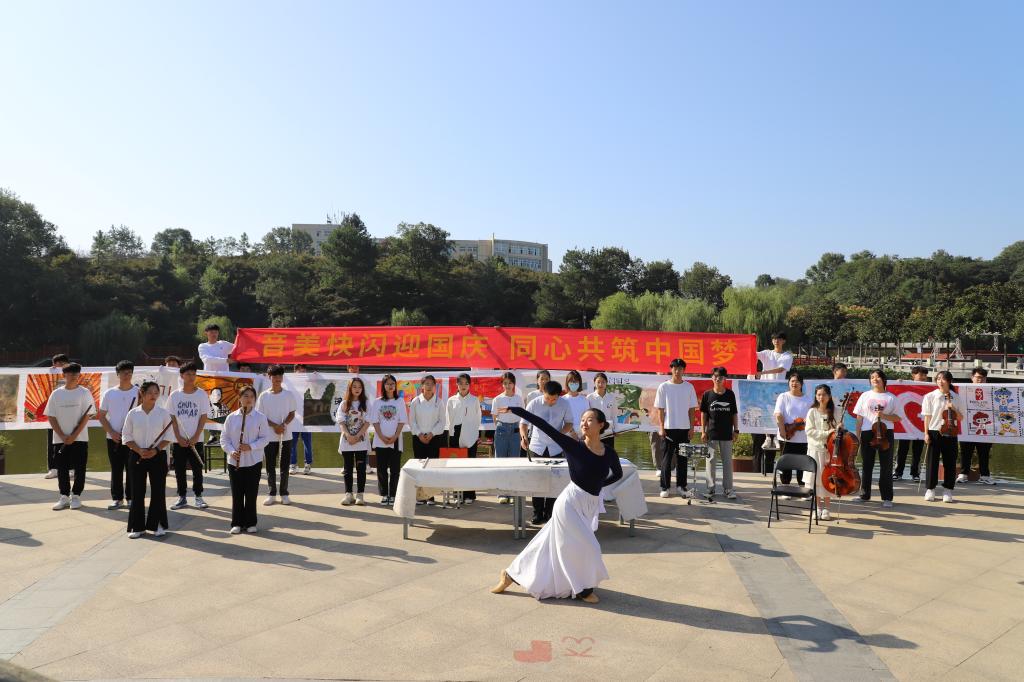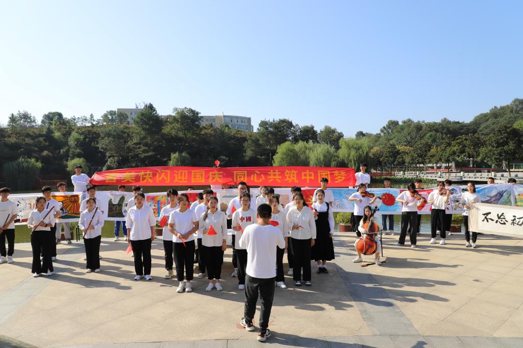 欣望江山千里秀,欢颂祖国万年春。在今天这个举国欢庆的美好日子里,由伟德和美术与设计公司联合举办迎国庆快闪活动,在图书馆前的半亩塘顺利举行,校团委领导副书记常青,伟德、美术与设计公司党委副书记,师生代表以及在场300余名同学观看了此次活动。